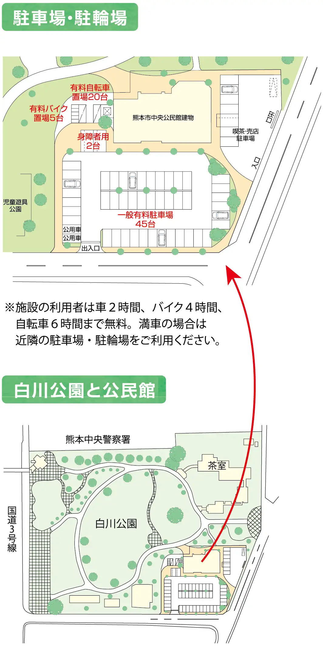 駐車場(45台)と駐輪場(バイク5台、自転車25台)は有料で、施設の利用者は無料(車2時間、バイク4時間、自転車6時間まで)です。